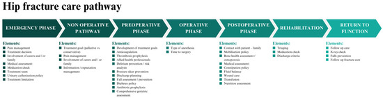 The intention was to categorize the care elements according to Donabedian’s healthcare quality model to identify the protocols’ structural, process, and outcome elements [22]. However, all identified care elements were process-related. Consequently, the researchers chose to report the care elements by following the care pathway of the Orthogeriatric Care Model of the FFN, encompassing the emergency phase, pre-operative phase, operative phase, post-operative phase, rehabilitation, and return to function [23]. A non-operative phase was added separately since it recurred in several care pathways. Structural elements were identified within the care pathways: in- and exclusion criteria, the use of quality indicators, and responsibility tables or flowcharts.