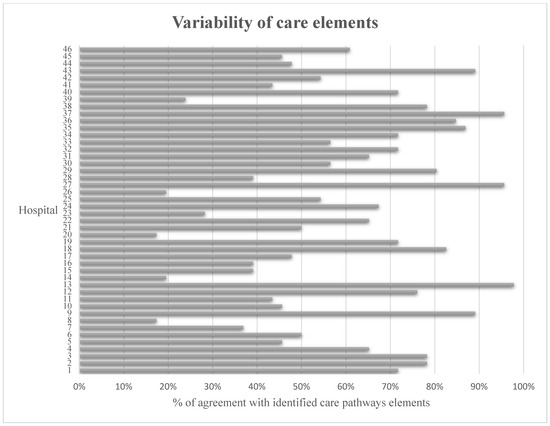 A detailed overview of the care elements with a description of the content is provided in Figure 2. In total, 43 care elements were identified by the content analysis. The presence of the care elements varied between 7% (information–expectation management in the non-operative phase) and 87% (delirium prevention/risk analysis) (Figure 3). Several elements were present in >70% of the hip fracture care pathways, including pain management, medical assessment—blood tests and electrocardiograms, a urinary catheterization policy, thrombosis prophylaxis, delirium prevention/risk analysis, discharge planning, and a mobilization policy (Table 1). Various care elements were present in less than 20% of the hip fracture care pathways, including pain management in the non-operative phase, the involvement of carers and/or family, and information/expectation management in the non-operative phase.