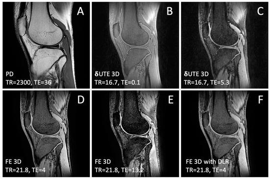 Source MRI images of (A) proton density (PD) fast spin echo, (B,C) delta ultrashort echo time (δUTE) at varying echo times (TE), (D,E) field echo (FE) at varying TE, and (F) FE with deep learning reconstruction (DLR).