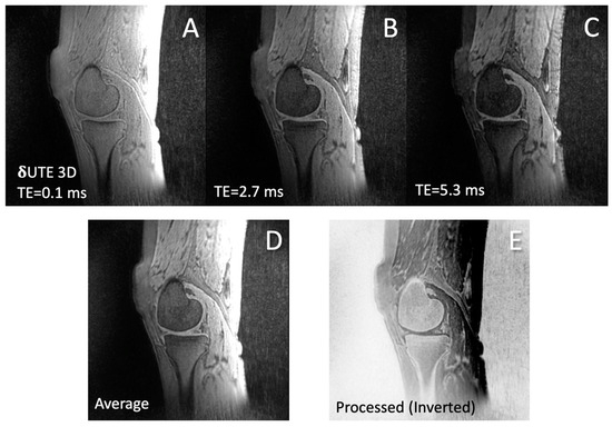 Image Processing: The goal of the image processing was to obtain a CT-like appearance of the bone from the MRI images acquired with the δUTE, FE, and FE HR–DLR sequences. A simple processing was performed directly on the scanner console. For each sequence, all of the source images from different TEs (Figure 2A–C) were averaged (Figure 2D) and then inverted to yield the final processed image (Figure 2E), following Equation (1).