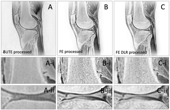 CT-like Images: After processing, the δUTE images (Figure 3A) had a CT-like contrast, depicting cortical bone with high signal intensity (Figure 3A-i) but most other soft tissues with mid-to-low signal intensity. However, the δUTE-processed images could not resolve trabecular bone (Figure 3A-ii). In contrast, both the FE- (Figure 3B) and FE HR–DLR-processed images (Figure 3C) depicted the cortical and trabecular bone with high signal intensity. While the FE and FE HR–DLR images were similar overall, the FE HR–DLR appeared slightly sharper (Figure 3C-i) and depicted cortical bone as thinner structure (Figure 3C-i,ii), while the FE images (Figure 3B) appeared more contrasted particularly between the trabecular bone and the bone marrow. This suggested that, due to higher resolution, the FE HR–DLR could be useful for evaluating small bone injuries, such as hairline fracture, or changes in the trabecular bone, for example, during osteoporosis.