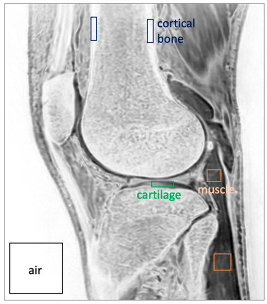 Regions of interest including cortical bone, muscle, cartilage, and air, analyzed to determine SNR and CNR.