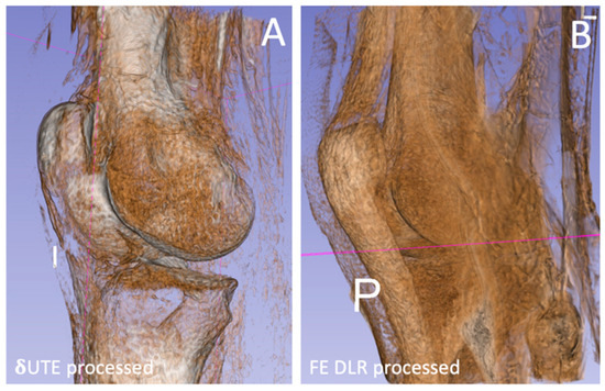 3D Bone Rendering: Figure 5 shows the 3D-rendered images with the threshold set manually to render the bone, comparing the δUTE (Figure 5A) and FE HR–DLR (Figure 5B) data. While neither could perfectly segment the bone based on the signal intensity alone, the δUTE fared somewhat better, unlike the FE HR–DLR, which rendered many non-bone tissues with a similarly high signal intensity as bone tissues (e.g., tendons and ligaments).