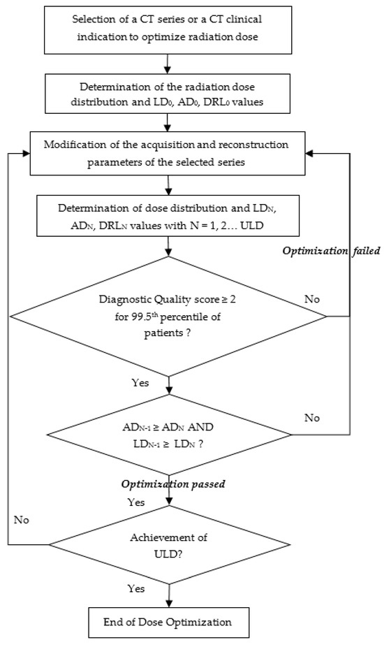 The process allows for step-by-step optimization to ensure diagnosis, and it can integrate the continuous development of new technologies and image reconstruction methods in CT, with the expectation of further reductions in radiation dose levels [25]. Indeed, newer post-processing technologies, such as iterative reconstructions algorithms, including projection-data-based [26], model-based [27], and combined hybrid and prior-projection-data-based [28], are now tending to replace filtered-back projection algorithms. Other promising reconstruction algorithms, deep-learning-based Convolution Neural Network [29,30], enable the denoising of low-dose CT images while achieving a similar level of diagnostic quality. Numerous algorithms are being currently developed but still require clinical validation. Special attention should be paid to observer lesion detection performance at moderate and strong radiation dose reductions [31], enhancing the need to constrain the process on both radiation dosimetry and image quality aspects. Implementation of this process will facilitate the optimization steps by setting the next goal until reaching an ultra-low dose [32].