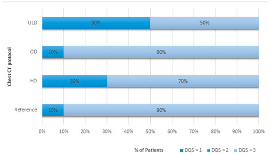 For the OD protocol, a reduction in Ref. kVp from 120 to 100 reduced significantly mean doses by—38.3% (9.7%). DLP values were significantly lower with the OD chest CT protocol at 131 [99; 189] mGy.cm compared with the reference protocol with DLP at 222 [178; 285] mGy.cm (Table 3). CTDIvol values were also significantly lower for the optimized-dose chest CT protocol compared to the reference protocol, decreasing from 6.3 [5.0; 8.0] mGy to 3.7 [2.7; 5.3] mGy, respectively. The DQS was scored greater than or equal to 2 for 10% of examinations and equal to 3 for more than 90% of examinations for both protocols (Figure 2).