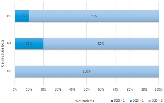 The first optimizing loop (N1) failed to meet all optimizing criteria. Although DQSs were greater than or equal to 2 for every patient, dose criteria were missed for one of two conditions (Figure 3). Indeed, the LD value expressed in DLP at the N1 level of the process was 176.1 mGy.cm. It was superior to the LD value of the N0 level, which was equal to 174.1 mGy.cm. In contrast, the analysis based on CTDIvol met the two dose criteria: the AD CTDIvol in N1, equal to 5.7 mGy, was less than the AD in N0, equal to 8.1 mGy, and the LD CTDIvol in N1, equal to 4.5 mGy, was less than the LD in N0, equal to 5.0 mGy (Table 4). The optimization process failed only when using the DLP, even if dose reduction between N0 and N1 levels was −25.6% (2.9%) and statistically different. Other parameters had to be changed.