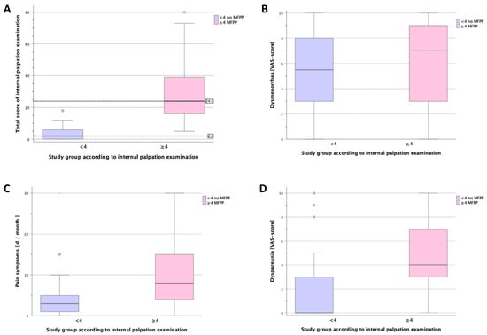 Comparison of internal palpation examination score (A), dysmenorrhea (B), pain symptoms (C), and dyspareunia (D) in women with and without MFPP. (A) Summary of internal palpation examination scores in the “no MFPP” and “MFPP” groups (p < 0.001). (B) Summary of mean dysmenorrhea intensity scores in the “no MFPP” and “MFPP” groups measured using a visual analog scale (p = 0.168). (C) Summary of the mean number of days per month with acyclic pain in the “no MFPP” and “MFPP” groups (p = 0.002). (D) Summary of the mean intensity of dyspareunia in the “no MFPP” and “MFPP” groups measured using a visual analog scale (p < 0.001).