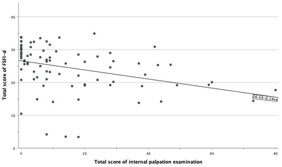 Total FSFI-d scores plotted against internal palpation examination scores for all 83 participants (r = −0.35; p < 0.001).