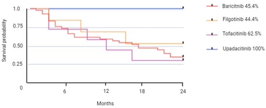 Therapeutic maintenance at 2 years for our entire cohort was 50% (n = 38), with 45.4% (n = 25) in the BAR group, 44.4% (n = 4) in the TOF group, 62.5% (n = 5) in the FIL group, and 100% (n = 4) in the UPA group (Table 2 and Figure 1). No significant difference in therapeutic maintenance was found between the four groups (p = 0.89). The average maintenance duration was 8.6 months and was similar in all groups. Of the 76 patients included in this study, 38 (50%) discontinued their treatment after two years of follow-up.