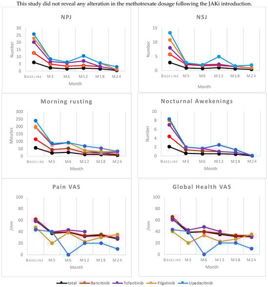 For all molecules, we observed a reduction in clinical parameters used in daily practice after three months of treatment. This improvement persisted over time for the BAR, TOF, and FIL parameters, with continuous decreases in these values during the first six months of treatment, followed by relative stability between months 6 and 24. However, in the UPA group, there was an increase in the number of swollen and painful joints, the number of nocturnal awakenings, and the pain and disease VAS scores at 12 months, without any identified factors and with improvement at 18 and 24 months.