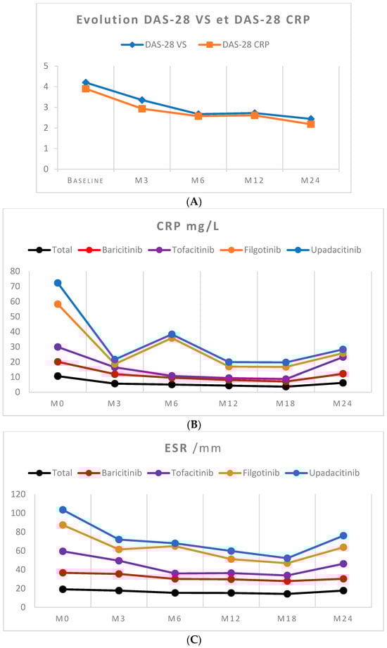 (A) Kinetic evolutions of DAS 28-ESR and DAS 28-CRP between initiation and 24 months. (B) Kinetic evolution CRP between initiation and 24 months. (C) Kinetic evolution ESR between initiation and 24 months.