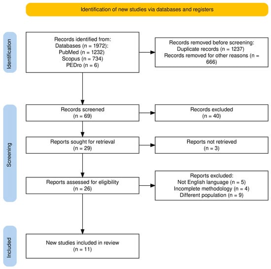 The internal validity of selected articles was assessed using the PEDro scale “https://pedro.org.au” (accessed on 23 January 2024) [,]. Based on 11 items, this scale estimates the internal and external validity of an RCT. Items include eligibility criteria, random allocation, concealment of allocation, group similarity at baseline, blinding of subjects, blinding of therapists, blinding of assessors, availability of key outcome measures in over 85% of participants, intention-to-treat analysis, comparisons between groups, point measures, and variability measures. With the exception of item 1, which assesses the generalizability, one point is awarded if each of the criteria is met. The maximum score is 10 points and a score of “1” is assigned for a positive response and “0” for a negative response. The cumulative score is derived by adding all affirmative answers, excluding the first item related to external validity assessment. The evaluation was conducted independently by the authors, with disagreements resolved through consensus.