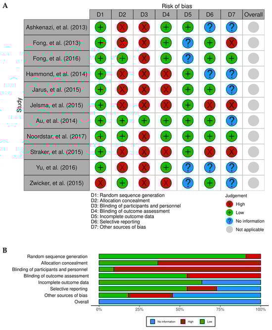 Risk of bias (RoB) traffic light plot of each individual study included (A), and weighted plot to assess overall RoB (B) via the Cochrane RoB tool (n = 11 studies). Green circles report low RoB, red circles report high RoB, and blue circles report insufficient information on RoB [,,,,,,,,,,].