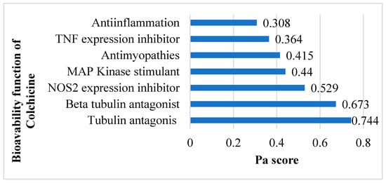 Managing inflammatory risk factors is crucial for preventing disease progression and improving patient outcomes [,,,,,,]. Colchicine is predicted to play a significant role in cardiac fibrosis and myocardial infarction, with a score greater than 0.5 as a tubulin antagonist, beta-tubulin antagonist, and NOS2 inhibitor. Colchicine’s mechanism of action involves binding to tubulin, thus hindering microtubule assembly and polymerization. This prediction aligns with the research conducted by McLoughlin and O’Boyle, which states that colchicine works by blocking β-tubulin and subsequently disrupting microtubule assembly []. Microtubules, crucial components of the cytoskeleton, are involved in various cellular processes, including maintaining cell shape, intracellular transport, cytokine and chemokine secretion, cell migration, ion channel regulation, and cell division, and are responsible for the subcellular arrangement of mitochondria and cardiac muscle cell dynamics []. Colchicine inhibits microtubule growth at low concentrations, while higher concentrations induce microtubule depolymerization. Microtubule depolymerization disrupts neutrophil adhesion and recruitment to inflamed tissues [].