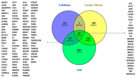 The target analysis of colchicine was performed using the Comparative Toxicogenomics Database (CTD) (http://ctdbase.org/, accessed on 17 February 2024) and DIGEP-Pred (http://www.way2drug.com/ge/, accessed on 17 February 2024) by entering colchicine’s SMILES structure. Genes and proteins associated with cardiac fibrosis and acute myocardial infarction were obtained from the DisGeNET and Open Target databases, accessed on 5 July 2023 []. Targets related to diseases and colchicine were then mapped using a Venn diagram to identify target intersections. Each identified target was annotated for its function using the Biological Function in the Database for Annotation, Visualization, and Integrated Discovery (DAVID) (https://david.ncifcrf.gov/, accessed on 29 May 2023 [].