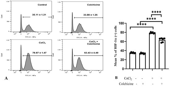 HIF-1α expression in the treatment groups. (A,B). (1) Control: The cell culture is not exposed to colchicine or CoCl2. (2) Administration of 300 µM CoCl2 for 24 h significantly increased HIF-1α expression in 3T3 cells compared to the control. (3) Administration of colchicine to cells not experiencing hypoxia (without CoCl2) resulted in a reduction in HIF-1α compared to the control, but it was not statistically significant. (4) Administering colchicine for 3 h post-hypoxia (CoCl2 24 h) reduced HIF-1α expression compared to that in the CoCl2 (hypoxia) group. **** p < 0.00.