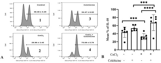 To confirm the association between colchicine and the IL-10 pathway in fibroblasts, we investigated IL-10 expression in 3T3 cells exposed to hypoxia and colchicine. Cells were first treated with CoCl2 (300 µM) for 24 h to induce hypoxia, mimicking the conditions studied in previous experiments. Colchicine (10 µM) was added, and the IL-10 levels were measured 24 h later using flow cytometry (Figure 6A).