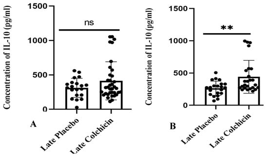 In contrast, a separate study found that administering colchicine to AMI patients 24 h late did not result in a significant difference in IL-10 levels between the treatment and control groups (p > 0.05, as shown in Figure 8A). However, the mean IL-10 level in the colchicine group displayed a trend towards being higher than the control group (413.8 ± 46.17 vs. 311.5 ± 31.02), as illustrated in Figure 8. Nevertheless, the mean IL-10 level after the administration of colchicine five days late significantly differed, showing higher IL-10 levels compared to the non-colchicine group (p < 0.01, as shown in Figure 8B), with average levels of 440.7 ± 50.95 vs. 263.8 ± 24.25).