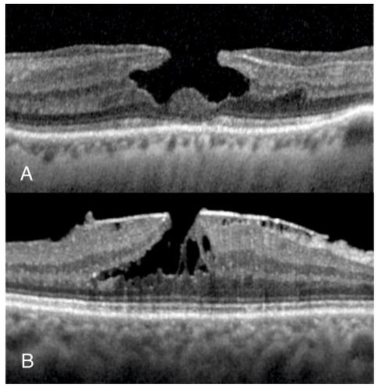 Sub-categories of lamellar macular holes. (A) Degenerative lamellar macular hole (D-LMH) is characterized by a foveal cavity with undermined edges and an irregular foveal contour with apparent loss of retinal tissue. (B) Epiretinal membrane foveoschisis (ERM-FS) is characterized by a contractile ERM with foveoschisis at the level of Henle-fibre layer.