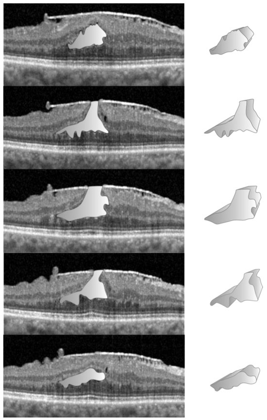 Diseases of the vitreoretinal interface result in a three-dimensional (3D) re-modelling of retinal tissue and there has been a growing interest recently in the potential role of retinal volumetric analysis in the diagnosis, treatment planning, and monitoring of these pathological entities [1,2,3,4,5,6,7,8]. Indeed, it has been suggested that retinal volumetric analysis may better reflect the in vivo alterations of retinal tissue caused by specific pathologies [1]. The clinical relevance of specific retinal volumes as biomarkers has already been demonstrated in several medical retinal diseases, such as diabetic retinopathy (DR), age-related macular degeneration (AMD), or glaucoma, ultimately contributing to improved patient outcomes and vision preservation [3,5,7,9,10,11]. In the vitreoretinal field, it was shown that the volume of specific entities, such as the foveal cavity (FC) in lamellar macular holes (LMHs), is associated with visual acuity at baseline and with the natural history of the disease during the follow-up period [1]. Moreover, in eyes with epiretinal membrane (ERM), higher pre-operative macular volumes were associated with worse visual outcomes after surgery [12].