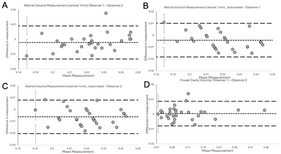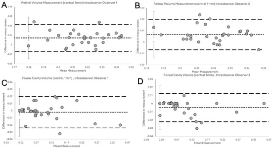 The Bland–Altman plots (Figure 4) show excellent agreement for inter-observer variability between the two observers (Figure 4A), between observer 1 and Spectralis (Figure 4B), between observer 2 and Spectralis (Figure 4C) for the measurements of RV in NFP eyes and between the two observers for measurements of the FC/FS volume in LMH eyes (Figure 4D).