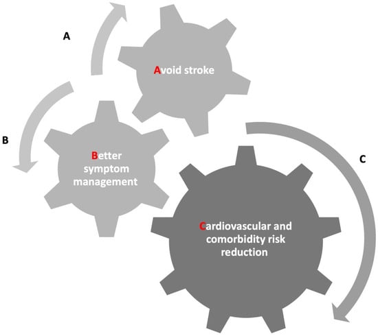 In this sense, the ESC guidelines advocate for the adoption of the ABC algorithm (“A”: Anticoagulants to prevent stroke; “B”: Symptom management optimization; “C”: Comprehensive management of cardiovascular health and comorbidities) [9] as a strategy to mitigate the risk of adverse clinical outcomes associated with AF (see Figure 2A–C and Table 1).