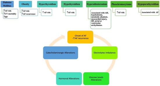 A correlation between AF and the most prevalent endocrine disorders has been shown [48] due to electrolytic and metabolic imbalances and hormone alterations that may create an environment conducive to the onset and recurrence of AF [49] (see Figure 3).