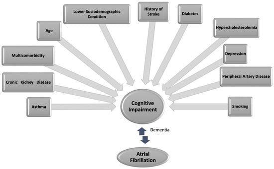 Association between cardiovascular risk factors, comorbidities, AF, and cognitive impairment. Cognitive impairment and AF share many risk factors and underlying comorbidities and correlate with the development of dementia in AF patients.