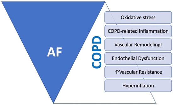 Acar et al. found that atrial electromechanical delay prolongation measured from the lateral tricuspid annulus is independently related to the forced vital capacity (FEV)1/FVC ratio [160]. Increased P-wave dispersion (PWD)—the difference between maximum and minimum P-wave duration—is an independent risk factor for AF development, more pronounced in the acute phase and in patients with frequent exacerbations, indicating its potential as a target for predicting, preventing, and treating acute COPD exacerbations [161,162]. P-wave duration and PQ interval are also risk factors for AF, with a strong correlation between P-wave duration and PQ interval > 150 ms [163]. However, little value in using P-wave signal-averaged electrocardiography (SAECG) and atrial late potential detection for arrhythmic risk assessment in acute COPD exacerbations has been suggested [163]. Furthermore, COPD is associated with LV diastolic dysfunction [164,165,166], which correlates with disease severity and may be another mechanism for AF initiation and perpetuation [164,165,166]. Right ventricular (RV) systolic dysfunction and elevated systolic pulmonary artery pressure are independently linked to the RA volume index in pulmonary hypertension (PH) patients due to COPD, potentially promoting AF [164]. Hemodynamic overload or stretching of the RA from PH may increase the prevalence of non-pulmonary vein foci from the RA in COPD patients [167]. Oxidative stress and inflammation are key pathogenetic mechanisms in COPD [168] and are also implicated in AF initiation and perpetuation [168,169]. Therefore, it is plausible that COPD-related oxidative and inflammatory responses may promote AF development.