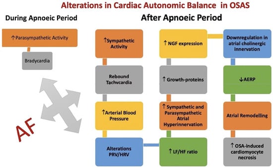 OSAS is a prevalent chronic condition affecting approximately 2–4% of adults, with a higher prevalence in older men [173,174,175]. This disorder is marked by recurrent episodes where the upper airway either partially or fully collapses during sleep, leading to reduced or halted airflow [176]. OSAS has been linked to the development of various CVDs, such as arrhythmias, AH, HF, and stroke [175,177]. There is a noted association between AF and OSA, and it has been determined that both conditions share numerous common risk factors, including sex, age, obesity, DM, smoking, and Helicobacter pylori infection [178]. Several mechanisms may contribute to the onset and progression of AF in individuals with OSAS [179]. During the acute phase, patients experience hypoxia, hypercapnia, changes in intrathoracic pressure, increased sympathetic activity, and autonomic dysfunction [179] (Figure 6). These repeated events can lead to structural and functional changes in the atria, including atrial remodeling and fibrosis. Continuous positive airway pressure (CPAP) therapy has been shown to reduce AF burden, regardless of the rhythm control strategy, including antiarrhythmic drugs, direct current cardioversion, or CA [180,181]. Moreover, CPAP treatment has been associated with a lower likelihood of developing permanent AF compared to not using CPAP [175].