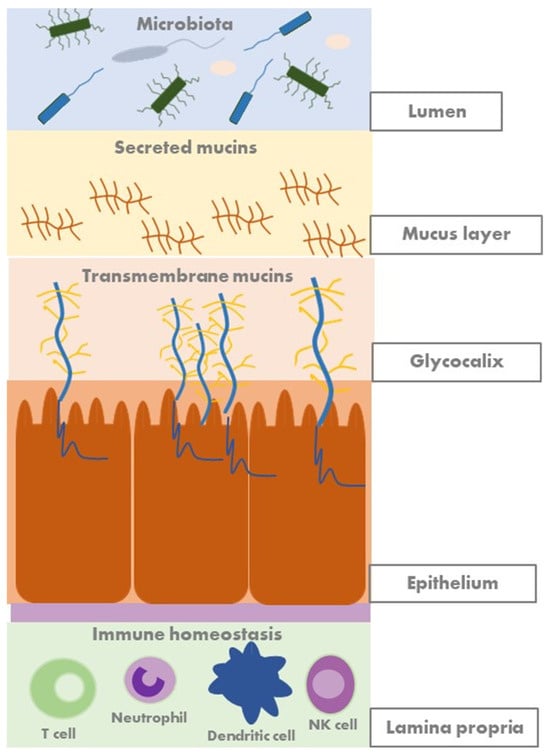 Furthermore, a recent study has shown that the intestinal aberrant mucin mRNA expression levels are associated with IBD presentation and activity, highlighting their potential as biomarkers to monitor mucosal barrier function in IBD [15]. Mucins have also immunological effects, binding directly to immune cells [14], and play a crucial role in interacting with the gut microbiota, providing nutrients and attachment sites. Figure 2 shows a schematic representation of the human gut mucosal barrier.