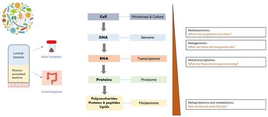 For decades, microbiology has relied on culture-dependent methods to identify bacteria involved in human health or disease. Culture-dependent methods involve the cultivation of microorganisms in the laboratory and the determination of the viable population of microorganisms. These methods enable the classification of bacteria to the species and strain level. However, only a fraction of the microbial populations can be identified, due to the bias towards bacteria that proliferate under laboratory conditions. Nonetheless, the development of molecular diagnostic techniques, mainly next-generation sequencing (NGS) techniques, represents a breakthrough in understanding the human gastrointestinal microbiome, enabling the discovery and characterisation of unculturable microorganisms and the prediction of their functions [19,20]. Figure 3 summarises the multi-omics techniques that can be used for the study of the human gut microbiome in IBD.