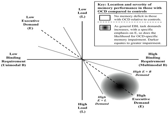 The initial step towards a solution was proposed by Greisberg and McKay [21], who suggested a more subtle approach to understanding memory performance in individuals with OCD, noting that memory impairments are secondary to executive dysfunction. As Harkin and Kessler [43] went on to elucidate, “If a memory task taps into a dysfunctional component of executive functioning, memory impairment will follow” (p. 1005). In essence, it is the cognitive demands imposed by a particular memory task on executive functioning that distinguish the memory performance of individuals with OCD from that of control subjects [17]. Building upon the foundational executive memory explanation, Harkin and Kessler [43] further expanded the framework by incorporating three essential components of a task: executive functioning (E), binding complexity (B), and memory load (L), which resulted in the development of the EBL classification system. Executive function was defined after Diamond’s [58,59] tripartite definition, consisting of inhibition (e.g., top-down selective activation of task-relevant representations and inhibition of task-irrelevant stimuli and responses), working memory (maintenance and updating), and flexibility (the capacity to dynamically distribute resources for processing and managing information in an ever-evolving environment) (see also [60]). Binding complexity refers to the extent that a WM task requires the binding of multimodal conjunctions in the pursuit of successful task performance [61]. Load refers to the number and amount of information that enters the WM either concurrently or sequentially [62].