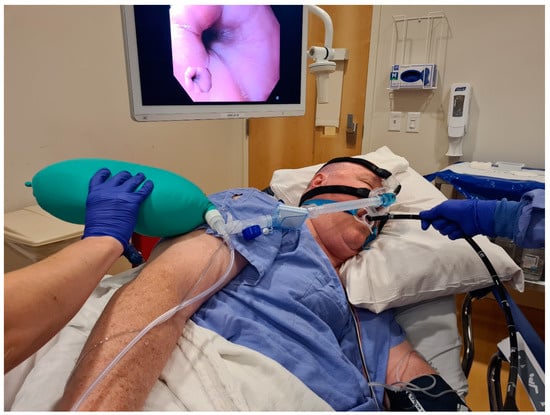 - Drews, J.; Harder, J.; Kaiser, H.; Soenarjo, M.; Spahlinger, D.; Wohlmuth, P.; Wirtz, S.; Eberhardt, R.; Bornitz, F.; Bunde, T.; et al. Impact of a simple non-invasive nasal mask device on intraprocedural hypoxemia in overweight individuals undergoing upper gastrointestinal endoscopy with sedation provided by a non-anesthesiologist provider. Clin. Endosc. 2023, 57, 196–202. [Google Scholar] [CrossRef] [PubMed]