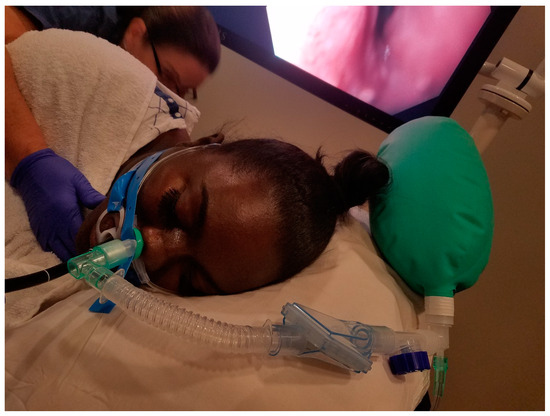 The Hospital of the University of Pennsylvania has extensive experience in the use of this technique over the last 15 years (Figure 2). One of the authors discussed their experience with this technique. Briefly, an appropriately sized soft nasal cannula (popularly called a nasal trumpet) is inserted into the nasal passage (on the more patent side, assessed before the procedure) under deep sedation and connected to a Mapleson breathing system or anesthesia breathing circuit. Oxygen flows of 6–8 L provide the same benefits as the nasal CPAP discussed above. This was found to minimize the incidence of desaturation in both routine and advanced procedures, including in the obese population [34,37].