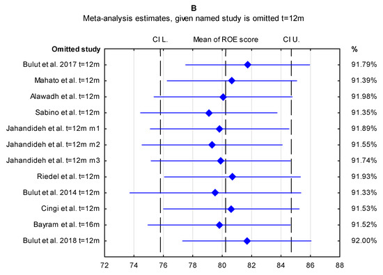 Sensitivity analysis for the effect of individual studies (given named study in the Y axis is omitted) on the pooled differences of ROE score. CI (confidence interval). (A) pre-treatment vs. post-treatment t = 12 m, (B) mean value of ROE score t = 12 m.