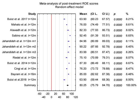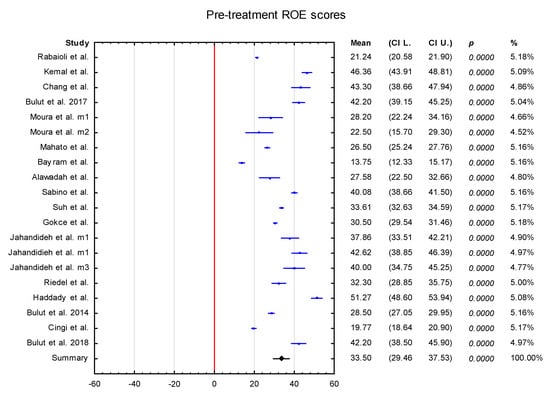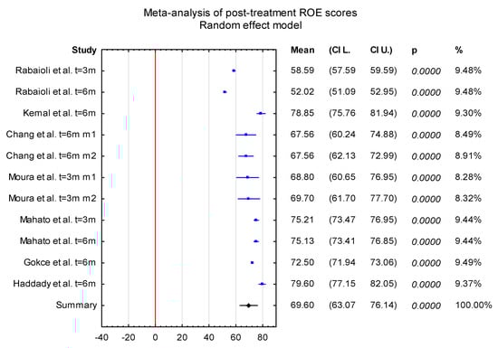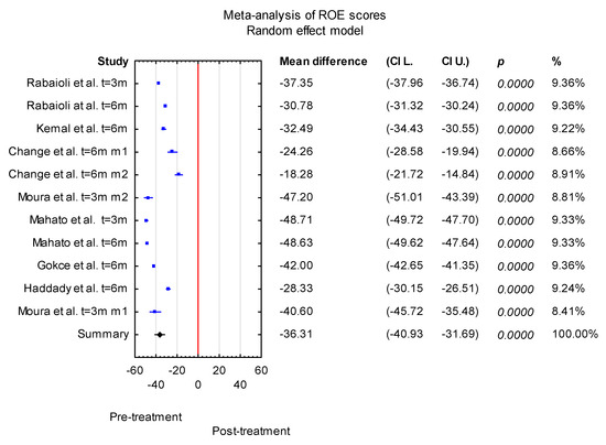 Overall, the forest plot for the pre-treatment vs. post-treatment results revealed that the studies denoted a higher value of ROE scores after treatment, and the increase was statistically significant in each case. However, there were differences among the included studies.