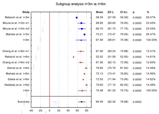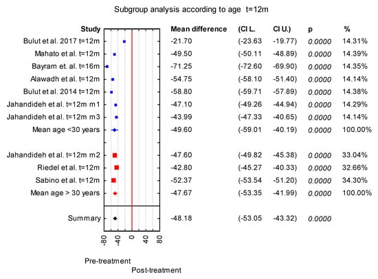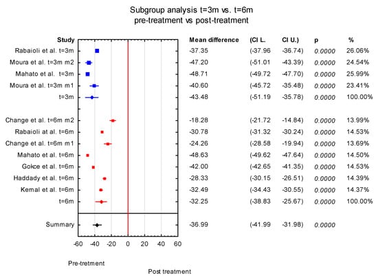 The subgroup analysis was also performed in case of mean difference between pre-treatment and post-treatment (3 months and 6 months). Here, we also received statistically significant results for the two subgroups (Figure 8).