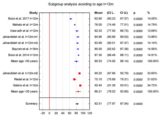 Since the heterogeneity among studies was high, a subgroup analysis was performed to try to find possible reasons for the variability of the results. The different time of grading of postoperative follow-up processes (3 months or 6 months), age (age < 30 years and age > 30 years), and surgical methods (rhinoplasty open approach vs. others) for time t = 12 m were considered for the subgroup analysis. In four publications that were included in the meta-analysis, results of the ROE were given 3 months after the procedure, and in seven publications the results were given after 6 months. Statistically significant results were received for the two subgroups (Figure 7 and Figure 8). Moreover, to conduct subgroup analysis for t = 12 m according to age, the considered publications were divided into two groups, patients with mean age lower than 30 years (group 1) and mean age higher than 30 years (group 2). For this division, the papers by Cingi et al. and Bulut et al. were excluded, as the mean age of the group of patients was not given [20,21]. In seven publications, the mean age of the group of patients was lower than 30 years, and in three it was higher than 30 years. Statistically significant results were received for the two subgroups (Figure 9 and Figure 10). Then, papers were divided according to surgical methods; five publications included open-approach rhinoplasty, while in the other eight involved other techniques. Statistically significant results were received for the two subgroups (Figure 11). However, it is important to note that for each case of division one of the subgroup analyses contained only three studies; thus, the true effect is difficult to establish.