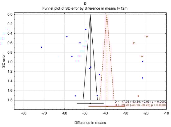 The trim-and-fill method was used to estimate the effect of potentially missing studies due to publication bias in the funnel plot for mean post-treatment ROE score and mean difference pre-treatment vs. post-treatment ROE score after t = 12 m. In the case of mean post-treatment ROE score, the received value was 81.67 (95% confidence interval from 77.31 to 86.02), and for pre-treatment vs. post-treatment the value was −39.20 (95% confidence interval from −48.13 to −30.26) (Figure 12).