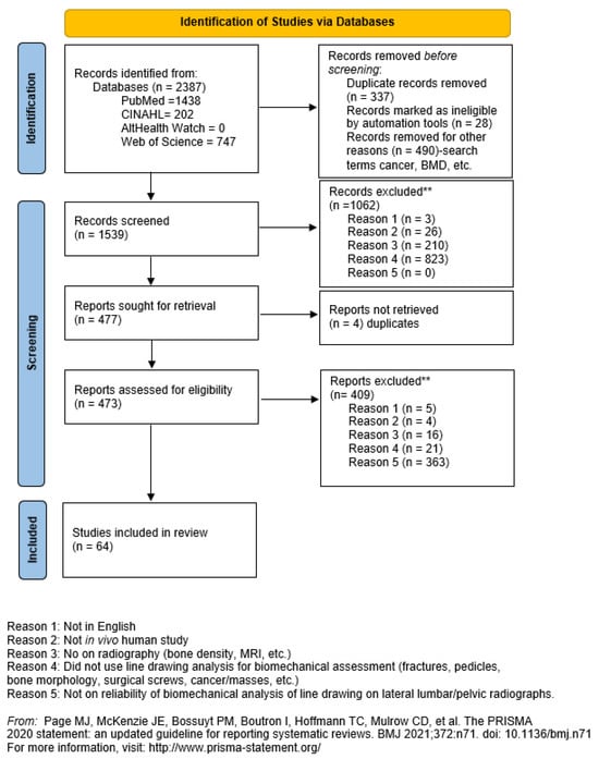 The remaining 1539 article titles and abstracts were screened by two independent reviewers according to the inclusion and exclusion criteria and a third for discrepencies between the first two. Database records identified were PubMed (n = 1438), CINAHL (n = 202), AltHealth Watch (n = 0), and Web Of Science (n = 747). Records removed prior to screening were due to duplication (n = 337), ineligible due to automation tool usage (n = 28), and records removed for other reasons such as pathologies, anomalies, bone mineral density, etc. (n = 490). The total records removed prior to screening was 855. In total, 1062 studies were excluded by the two independent reviewers prior to retrieval request leaving 477 studies remaining. Exclusions are shown in Figure 2 of the PRISMA diagram.