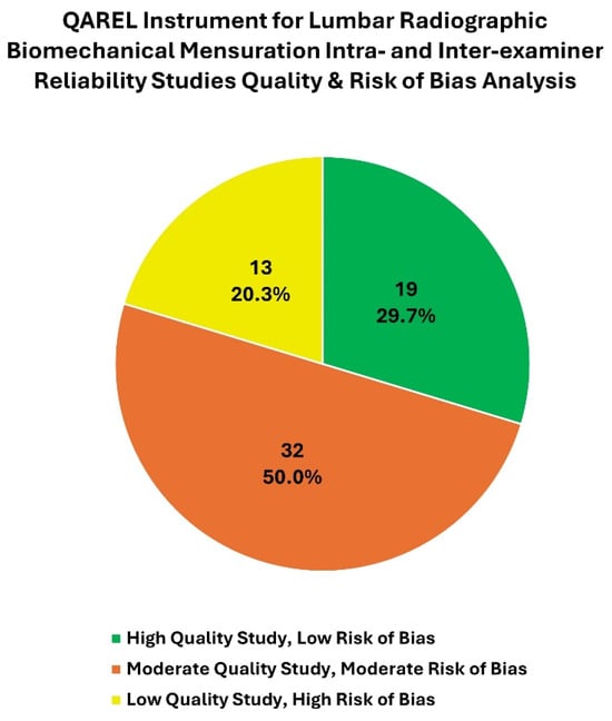 This pie chart represents the number and percentage of high-, moderate-, and low-quality (indicating low, moderate, and high risk of bias, respectively) intra- and inter-examiner reliability studies for lumbar radiographic biomechanical mensuration methods using the QAREL instrument (Table S1).