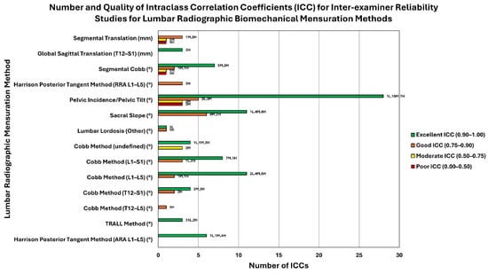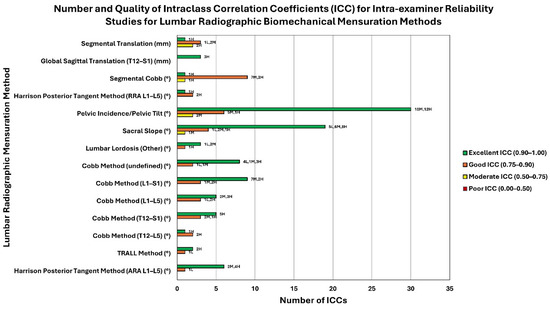 This cluster bar chart represents the quality of reliability, quality of study, and number of studies found for intra-examiner reliability of lumbar radiographic biomechanical mensuration methods (Table S2). Each mensuration method (y-axis) may have up to four bars showing the number of ICCs (x-axis) for each lumbar radiographic mensuration method (y-axis) representing the quality of ICC (excellent, good, moderate, or poor; see legend for color). The data labels at the outside end of the bars represent the number of low- (L), moderate- (M), and high-quality (H) studies (as determined using the QAREL instrument) that comprise the total number of studies for a given ICC quality (excellent, good, moderate, or poor). For example, The Harrison Posterior Tangent Method (ARA L1-L5) shows 6 excellent intra-examiner ICCs (comprised of 2 moderate-quality studies and 4 high-quality studies) and 1 good intra-examiner ICC (comprised of 1 low-quality study). The unit of measurement (° or mm) for each lumbar radiographic biomechanical mensuration method is indicated in parentheses next to the mensuration method.