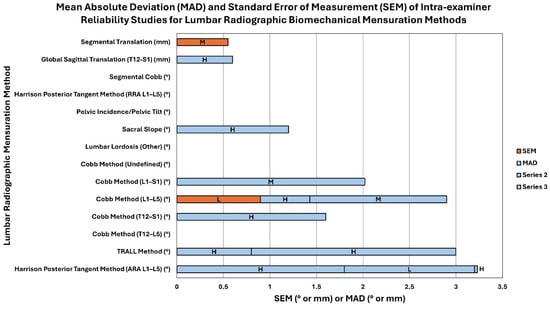 This is a stacked bar chart representing the mean absolute deviation (MAD) and standard error of measurement (SEM) found in intra-examiner reliability studies for lumbar radiographic biomechanical mensuration methods (Table S2). The stacked bars show the number values of the MAD and SEM (x-axis; see legend for color) for each lumbar radiographic mensuration method (y-axis) and the letter in each bar represents the quality of the study as determined by the QAREL instrument (L = low quality, M = moderate quality, and H = high uality). The unit of measurement (° or mm) for each lumbar radiographic biomechanical mensuration method is indicated in parentheses next to the mensuration method.