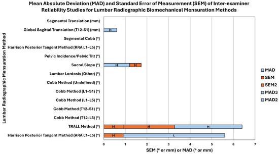 This is a stacked bar chart representing the mean absolute deviation (MAD) and standard error of measurement (SEM) found in inter-examiner reliability studies for lumbar radiographic biomechanical mensuration methods (Table S3). The stacked bars show the number values of the MAD and SEM (x-axis; see legend for color) for each lumbar radiographic mensuration method (y-axis) and the letter in each bar represents the quality of the study as determined by the QAREL instrument (L = low quality, M = moderate quality, and H = high quality). The unit of measurement (° or mm) for each lumbar radiographic biomechanical mensuration method is indicated in parentheses next to the mensuration method.