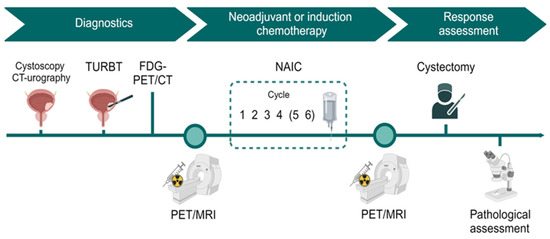 Patients diagnosed with cT2-T4aN0-N1M0 bladder cancer who were fit for cisplatin-based neoadjuvant or induction chemotherapy and subsequent radical cystectomy were eligible for the study. Clinical TNM stage was evaluated by transurethral resection of the bladder tumor (TURBT), CT-urography, and 18F-fluordeoxyglucose (FDG) PET-CT.