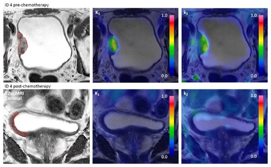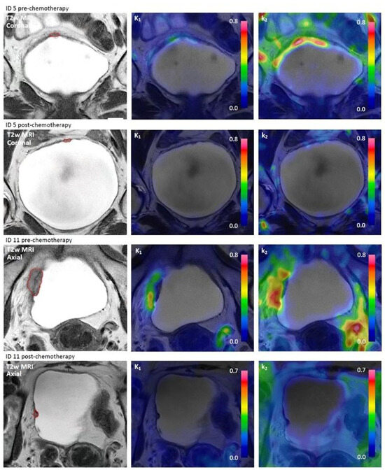 T2-weighted (T2w) MRI and [15O]H2O PET parametric images (K1 and k2) pre- and post-chemotherapy of three study patients. ID 4 had wall thickening on T2w MRI but decreased tumor blood flow (TBF) post-chemotherapy and had ypT1b + Tis. ID 5 had no visible tumor and decreased TBF post-chemotherapy and had ypT0. ID 11 had suspect volume of interest but decreased TBF post-chemotherapy, and patient had ypT0.