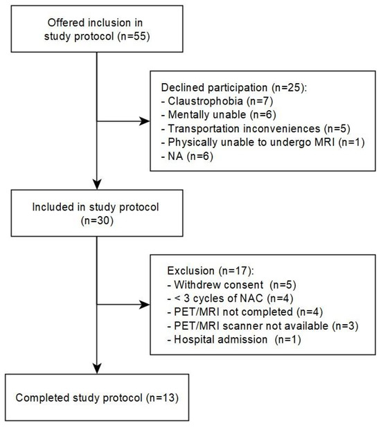 Between June 2020 and June 2023, 55 patients diagnosed with MIBC and scheduled for neoadjuvant or induction chemotherapy and radical cystectomy at a single university hospital center were offered inclusion in the study protocol. Of these, 30 patients were enrolled in the study and 13 patients (43%) completed a [15O]H2O PET/MRI scan before and after chemotherapy (Figure 3). Table 1 shows the patient, clinical, and histopathological details of the 13 study patients who completed protocol. The median age was 64 years (range 50–72 years). The median time from study enrollment to radical cystectomy was 123 days (range 85–180 days). The median time from TURBT to pre-chemotherapy PET/MRI was 32 days (range 20–65 days). The median time from last dose of chemotherapy to post-chemotherapy PET/MRI scan was 19 days (range 11–34 days).