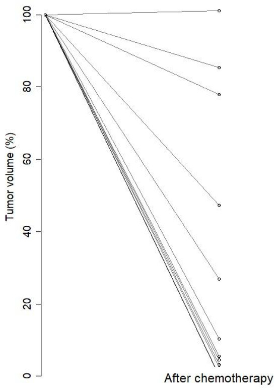Figure 4 shows the percentage change in tumor size post-chemotherapy when tumor size pre-chemotherapy is set at 100%. We found no statistically significant correlation between pre-chemotherapy TBF and spherical tumor volume at pre-chemotherapy PET/MRI (rho = 0.05, p = 0.86), either when evaluating the association between change before and after chemotherapy in tumor volume and change in TBF (rho = 0.08, p = 0.79).