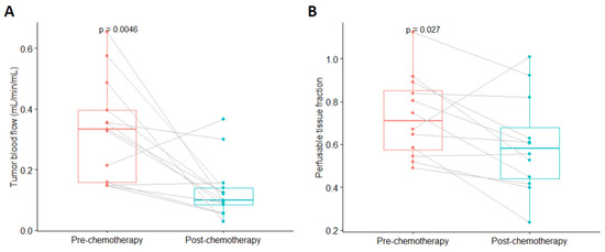 Tumor blood flow and perfusable tissue fraction pre- and post-chemotherapy. (A) Tumor blood flow. (B) Perfusable tissue fraction.